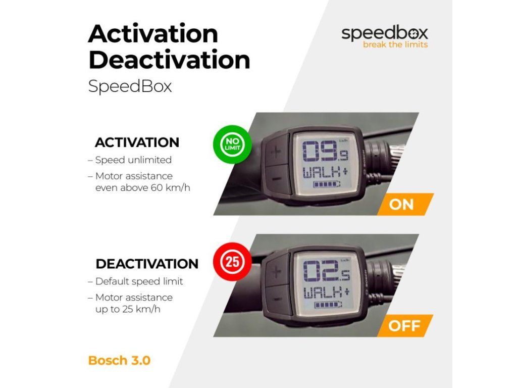 Aktivaci tuningu SpeedBox 3.0 provedeš na ovladači elektrokola. Po aktivacu funkce WALK se na displeji krátce zobrazí hodnota 9,9 km/h (6,2 mph) a od té chvíle můžeš jet neomezenou rychlostí – 40 km/h, 50 km/h i více než 60 km/h.